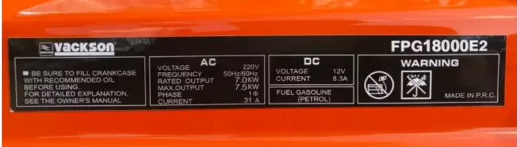 این ژنراتور برق تحتعنوان مدل «VACKSON FPG18000E2» عرضه شده است. این موتور برق انرژی موردنیاز خود را از طریق احتراق بنزین تامین میکند. مخزن سوخت بنزین این محصول حجمی برابر با 25 لیتر دارد. موتوری که از این سوخت انرژی الکتریکی تولید میکند، از نوع چهارزمانه است و قدرتی معادل 16 اسب بخار دارد. ظرفیت این موتور 440 سیسی است. این موتور تکسیلندری به کمک جریان هوا خنک میشود و صدای 97 دسیبلی تولید میکند. با کمک این محصول میتوانید برق AC و DC موردنیاز دستگاههای برقی خود را تامین کنید. سیم پیچی موتور برقهای واکسون 100% از مس میباشد . توان این ژنراتور 7500 وات است و از طریق دو پریز درپوشدار برق AC را در اختیار کاربر قرار میدهد. این برق ولتاژی برابر با 220 ولت دارد. همچنین برق DC خروجی نیز با ولتاژی برابر 12 ولت از شدتجریانی 8.3 آمپری برخوردار است. این محصول وزن مناسبی دارد که به راحتی قابل جا به جای است.